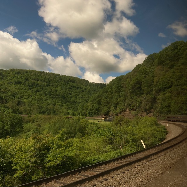 The conductor gave us a heads up that this is the “world famous horseshoe curve”. I suppose there are a number of these remarkable moments, similar to the one climbing up to Colorado heading west on the Zephyr and the Coast Starlight wandering its way to San Luis Obispo. Here you can see the tail of the train and I am in the first passenger car. As a Californian I am continuously surprised by the lush green landscape, even though I grew up on the East Coast.